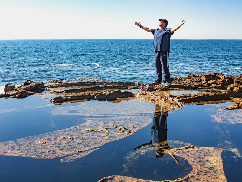 Tourism operator in cowboy hat stands in outback setting with vintage red truck behind.